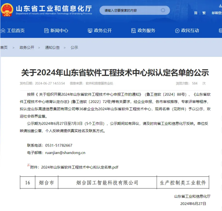 近日,山東省工信廳公示了2024年山東省軟件工程技術中心名單,全省共36家企業入圍,煙臺國工智能科技有限公司成功入選。