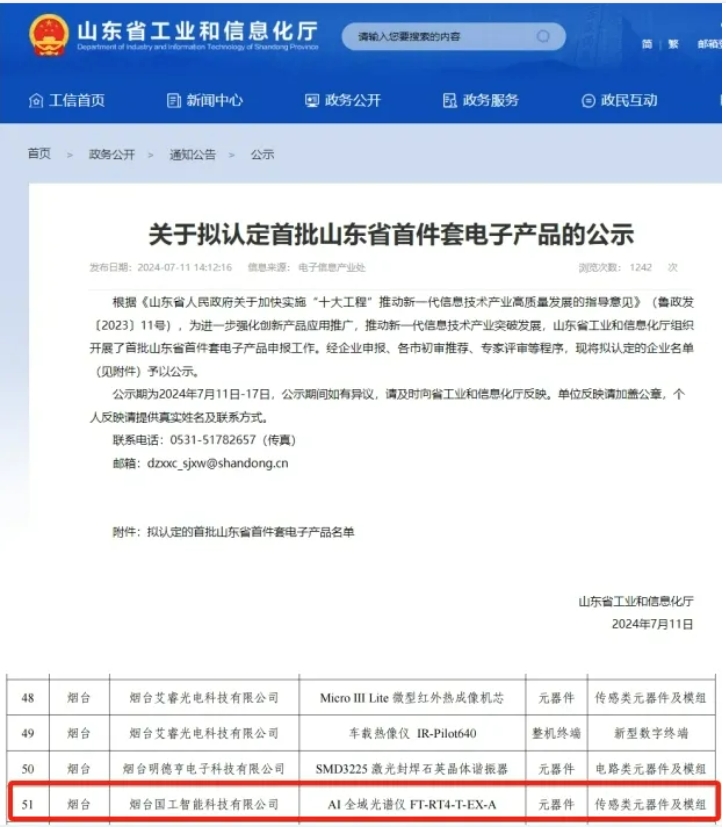 2024年7月11日,山東省工業(yè)和信息化廳公示首批山東省首件套電子產(chǎn)品,全省共有73項(xiàng)產(chǎn)品入選。作為煙臺(tái)上榜的三家企業(yè)之一,國工智能AI全域光譜儀成功入選。