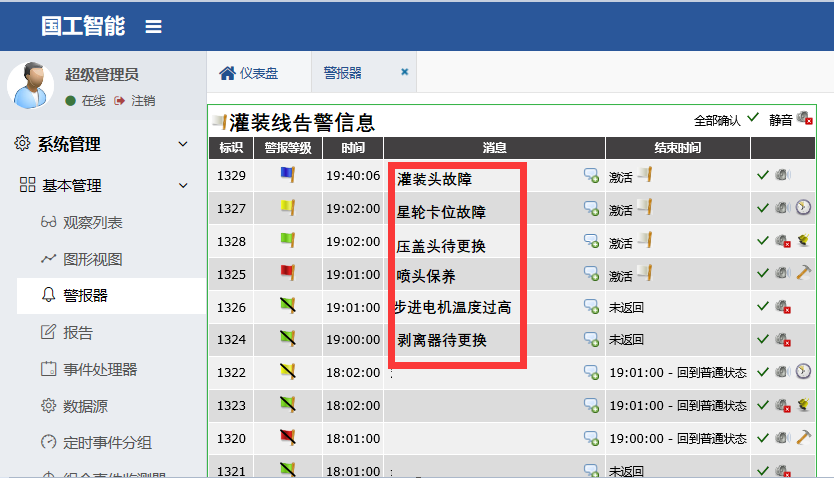 2、設(shè)備管理系統(tǒng)獲取實(shí)時(shí)數(shù)據(jù)庫(kù)的設(shè)備運(yùn)轉(zhuǎn)數(shù)據(jù)、MES系統(tǒng)的排班信息(也可直接錄入)進(jìn)行設(shè)備運(yùn)轉(zhuǎn)狀態(tài)的遠(yuǎn)程集中監(jiān)視。