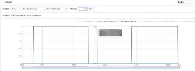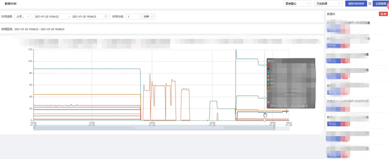 根據(jù)用戶的需要,對(duì)一段時(shí)間內(nèi)的歷史數(shù)據(jù)或?qū)崟r(shí)數(shù)據(jù)按照一定的統(tǒng)計(jì)頻率進(jìn)行多個(gè)維度的數(shù)據(jù)分析,統(tǒng)計(jì)頻率包含不限、10秒、30秒、10分鐘、30分鐘、1小時(shí),通過添加變量操作,在彈出的變量選擇彈窗中可多選數(shù)據(jù)點(diǎn)信息進(jìn)行分析;數(shù)據(jù)分析得到的圖表顯示形式包括折線圖以及表格形式。多個(gè)數(shù)據(jù)點(diǎn)信息圖表的展示形式包括平鋪、疊加、標(biāo)簽顯示以及合并表格顯示,根據(jù)不同的需求選擇對(duì)應(yīng)的展示形式,靈活性高。數(shù)據(jù)分析幫助用戶分析用戶想要分析的內(nèi)容,如數(shù)據(jù)走向,問題等,可以將分析的邏輯進(jìn)行保存并可以按部門和人員進(jìn)行公開,從而幫助用戶解決問題。(可參考圖1.1)