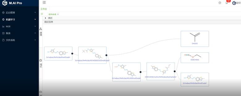 但如果近似性搜索庫中沒有近似項,那么系統會調用逆向合成機器人,系統會逆向推導所需化合物的合成過程以及合成途徑中所引用的相關文獻,并會自動生成多條合成路徑,來擴展研發人員的研發思路。通過相應的路線和可參考的資料,企業可以進行人為干預的合成路線實驗設計和修正,同時人工智能算法會自動學習企業常用的化合物和合成習慣,從而可以將整個研發團隊的經驗進行數字化積累。