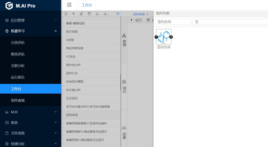 首先打開國工數據大腦平臺。依次進行操作:機器學習-->工作臺—>新建逆向合成計算流程—>拉取逆向合成組件(圖1)