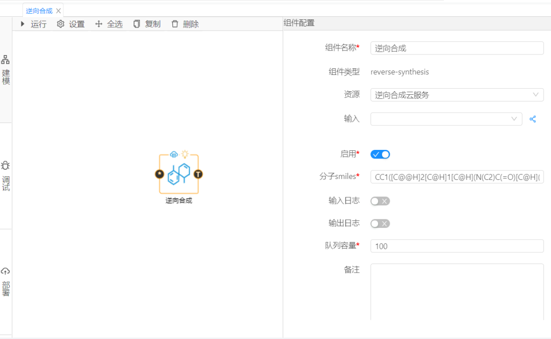然后,進行組件配置。資源項選擇逆向合成云服務,分子式填入參與反應的相關反應的SMILES表達式,并按照相應規則填入,如圖2所示。最后點擊調試,當顯示運行成功時即表示運行預測算法成功,平臺會將預測結果展現給用戶,結果如圖3所示。
