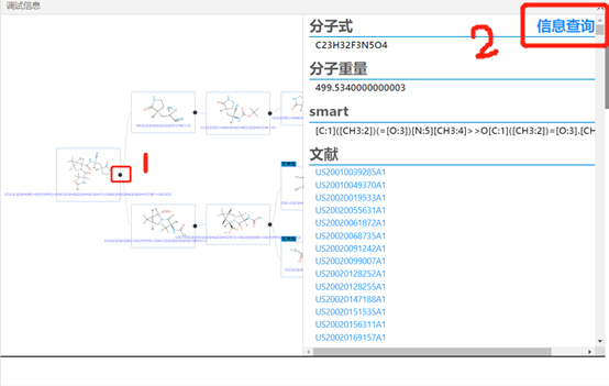 如圖4所示,每部反應點擊紅框1中的黑點,可以展示反應物的詳細信息如圖6所示,和該步反應可參考的文獻鏈接如圖5所示。