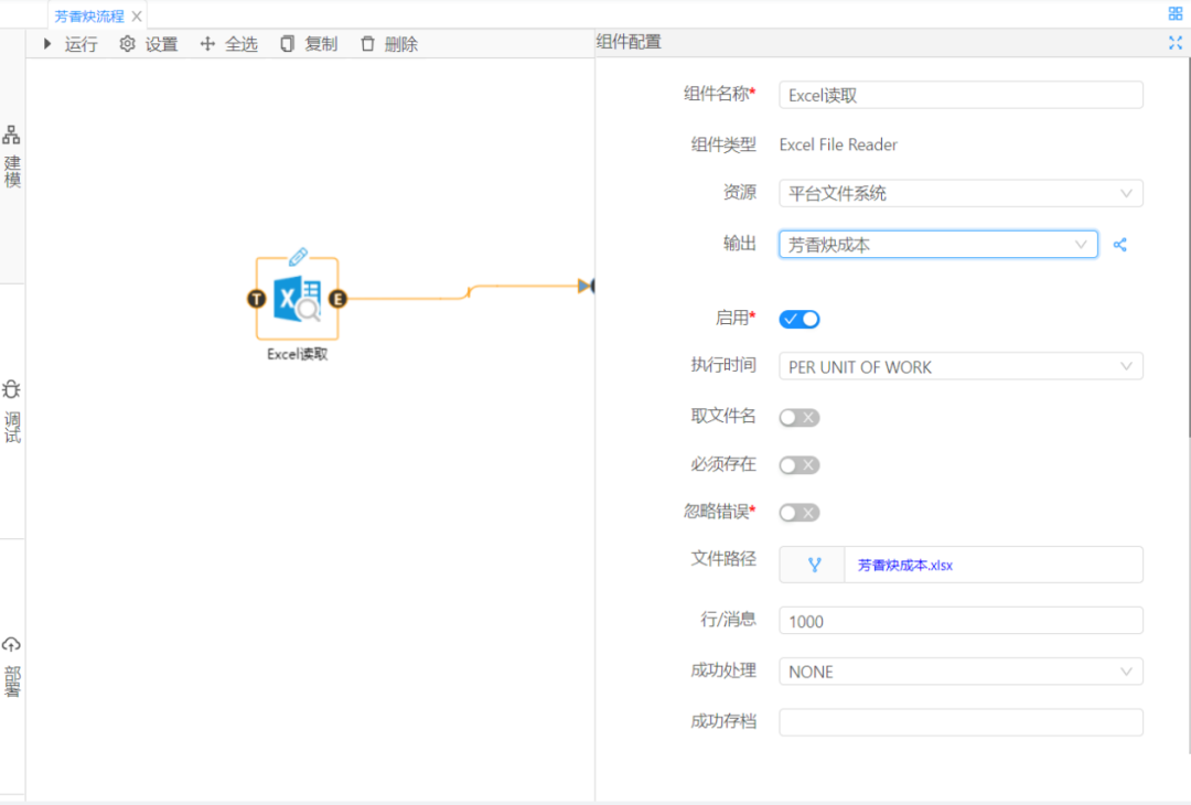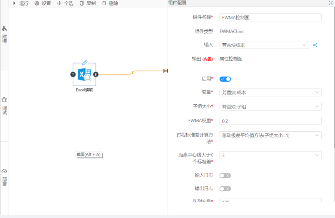 首先選取數(shù)據(jù)大腦的Excel讀取組件和EWMA控制圖組件,配置好相關資源,之后點擊左側(cè)的調(diào)試按鈕,如圖2,3所示: