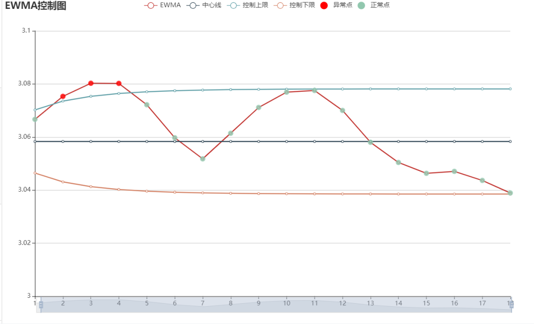 使用EWMA控制圖可以檢測過程均值的小偏移,因此該控制圖對個別高值或低值數(shù)據(jù)不敏感,比如生產(chǎn)過程中如果某個時間點的成本突然增高或者減少,則不會在控制圖中體現(xiàn)出來,因此如果想檢測單個數(shù)據(jù)的穩(wěn)定情況,可以使用Xbar_R控制圖或者I_MR控制圖。