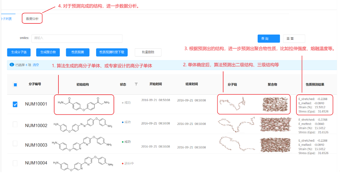 需要研發滿足某特定功能的新高分子材料時,可以利用性能預測模型快速篩選出具備潛力的單體分子。再利用分子量分布預測方法評估該單體在給定聚合條件下得到的分子量分布,然后基于單體、分子鏈和反應條件進行更準確的性能預測,如果滿足需求則進行實驗驗證,從而顯著的縮小需要搜索的化學空間。最后利用工藝優化算法確定最優的合成條件從而完成單體-結構-合成條件的研發流程。
