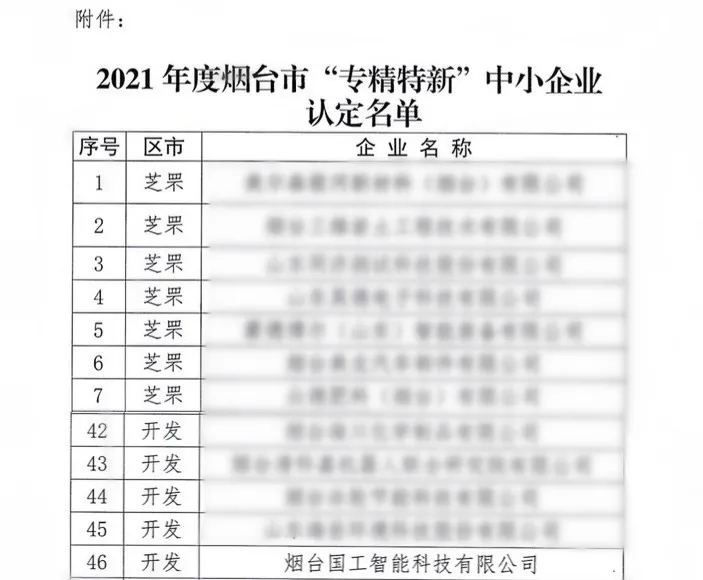 近日,煙臺市工業和信息化局公布了2021年度煙臺市“專精特新”中小企業名單,國工智能榮獲煙臺市“專精特新”中小企業榮譽稱號。